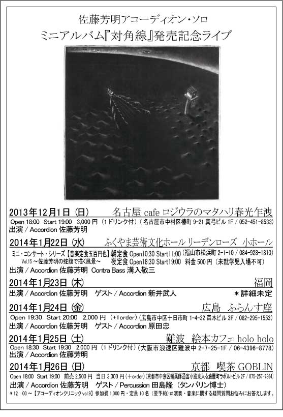 | 2014年1月26日(日) ●佐藤芳明(acc) ■ソロ〜ミニアルバム『対角線』発売記念ツアー | ||