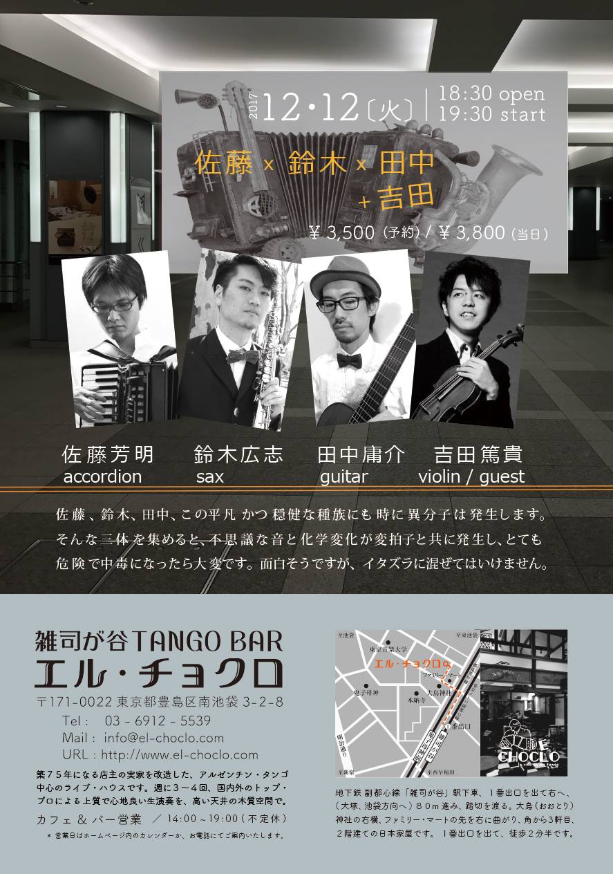 | 2017年12月12日(火) ●佐藤芳明(acc) ■佐藤鈴木田中‘吉田’ | ||