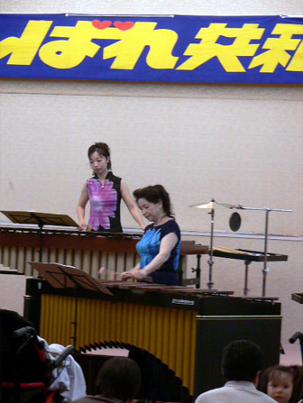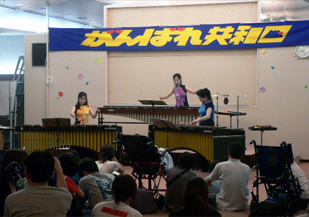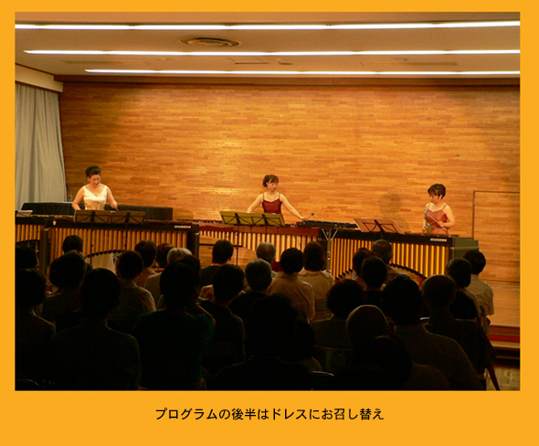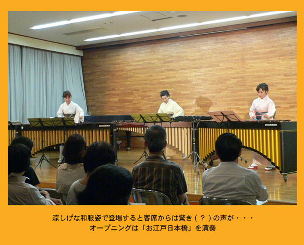 ●毎年、とても楽しみに待っていてくれる子ども達や家族の皆さんに、初めてPA機材なしで生演奏楽器のステージを届ける事になり、会場条件など心配しましたが、3台のマリンバの音は適度に響き渡り、なかなかの雰囲気にひと安心。夕食を終えお集まりの皆さんは、マリンバの包まれるような音色の曲にはとてもゆったりと静かに耳をかたむけていただき、また、子ども達は、手作り楽器やマラカスを持って「マツケンサンバU」に参加したり、アニメメドレーの歌を一緒に歌ったり、体でリズムをとりながらとても楽しそうでした。