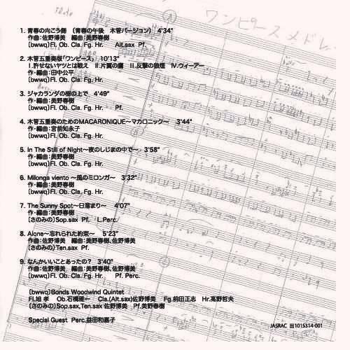 サックス&ピアノのデュオ(さのみの)による オリジナル作品を間に加え、 このアルバムのためにアレンジしていただいた 作曲家田中公平氏の 「木管五重奏版『ワンピース』」 宮前知永子氏の 「木管五重奏のためのMACARONIQUE 〜マカロニック〜」 など、これまでにない“新しい風”を表現した アルバムです。 決して多くはない木管五重奏のレパートリーに も新しいサウンド(風)を吹き込むことができ たのではないかと思います。