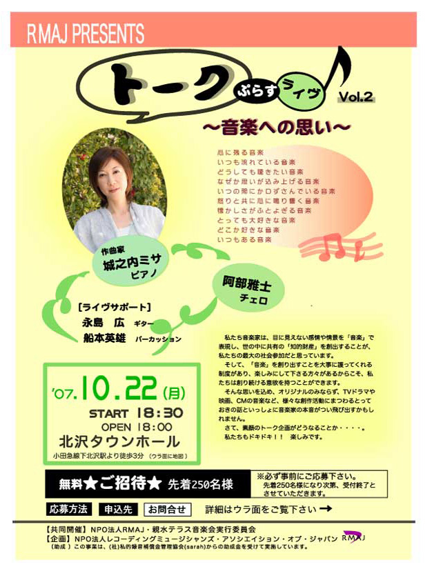 | ■ トークぷらすライヴ〜音楽への思い〜Vol.2■ 2007/10/22 | | ●○● 先着 250名様 無料 ご招待 ●○● ※必ず事前にご応募下さい! 右記のチラシ参照⇒⇒⇒ 10月22日(月) 開演PM6:30〜 北沢タウンホール(小田急線下北沢駅 徒歩3分) 作曲家【城之内ミサさん】をお迎えしておおくりします 公式サイト http://www.oursongs-creative.jp/johnouchi/main/main.html 参考記事:http://www.jti.co.jp/sstyle/my/cafe/113/index.html 【出演】 城之内ミサ(ピアノ)、阿部雅士(チェロ) サポート:永島広(ギター)、船本英雄(パーカッション)