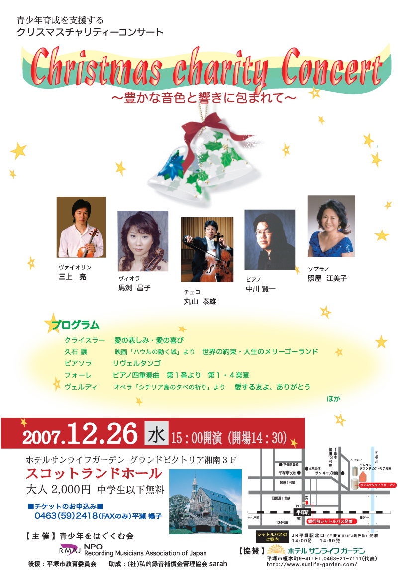 | ■ クリスマスチャリティコンサート■2007/12/26 | | 青少年育成を支援する クリスマスチャリティコンサート 〜豊かな音色と響きに包まれて〜