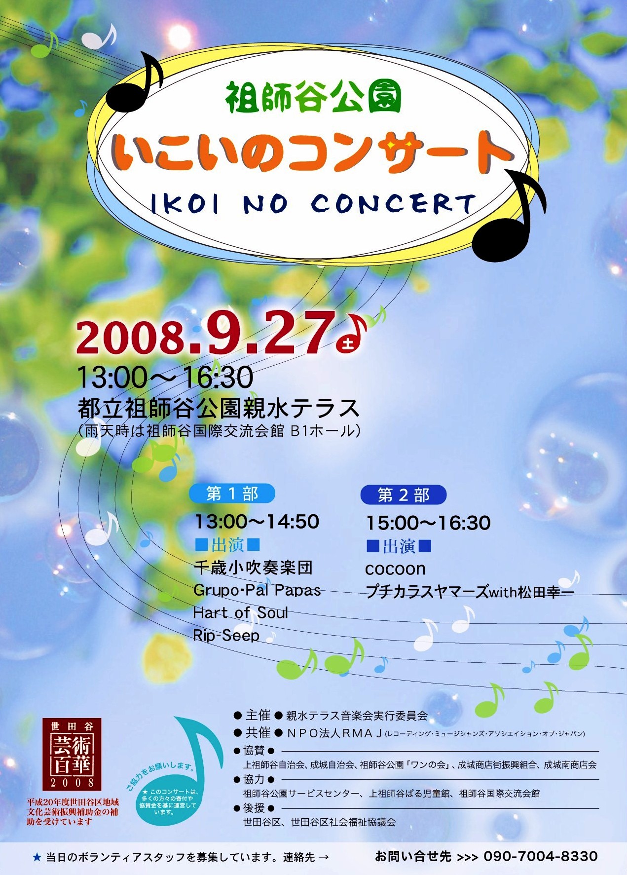 【主催】親水テラス音楽会実行委員会 http://blog.goo.ne.jp/ikoi2008 【共催】NPO法人RMAJ 【協賛】上祖師谷自治会 成城自治会 祖師谷公園「ワンの会」 【協力】都立祖師谷公園サービスセンター 上祖師谷ぱる児童館 祖師谷国際交流会館 成城商店街振興組合 成城南商店会 青少年上祖師谷地区委員会 【後援】世田谷区 世田谷区教育委員会 世田谷区社会福祉協議会 | |