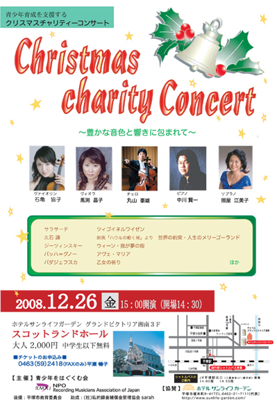 | ■ クリスマスチャリティコンサート■2008/12/26 | | 青少年育成を支援する クリスマスチャリティコンサート 〜豊かな音色と響きに包まれて〜