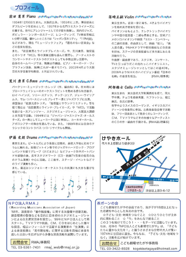 【主催】親水テラス音楽会実行委員会 http://blog.goo.ne.jp/ikoi2008 【共催】NPO法人RMAJ 【協賛】上祖師谷自治会 成城自治会 祖師谷公園「ワンの会」 成城商店街振興組合 成城南商店会 【協力】都立祖師谷公園サービスセンター 上祖師谷ぱる児童館 祖師谷国際交流会館 【後援】世田谷区 世田谷区社会福祉協議会 | |