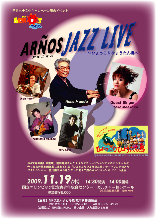 | ■ ARNOS JAZZ LIVE〜ひょっこりひょうたん島■11/19 | | 子ども_文化キャンペーン アルニョスin東京 〜アルニョス ジャズ ライヴ〜 会場_オリンピック記念青少年センター 小ホール 開演_14;30 開場_14:00 出演_前田憲男カルテット 前田憲男 Piano 伊藤史朗Dr. 細野よしひこGt. 加瀬 達Bs. ゲスト 前川陽子Singer 人形劇団ひとみ座 友松正人(トラヒゲ) 蓬田雅代(博士) 奥津洋子様(サンデー先生) 斉藤俊輔様(ドン・ガバチョ) 亀野直美様(ダンディー) JAZZ界の優しき重鎮、前田憲男さんとスタジオミュージシャンによるカルテットに、今もなお世代を超えて親しまれている 「ひょっこりひょうたん島」テーマソングの オリジナルシンガー、前川陽子さんをゲストに迎えて贈るオリジナル企画 ★☆★ 申込 受付中!! ★☆★