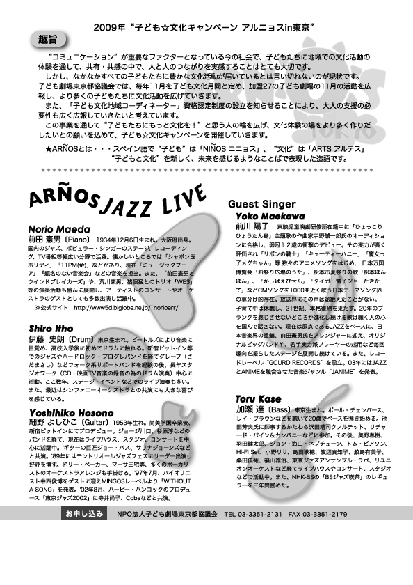 【主催】NPO法人子ども劇場東京都協議会 申込/問合せ TEL 03-3351-2131 FAX 03-3351-2179 <要> 参加券 ¥5,000(当日指定) 【企画協力】 NPO法人RMAJ 蒼い企画 人形劇団ひとみ座 | |