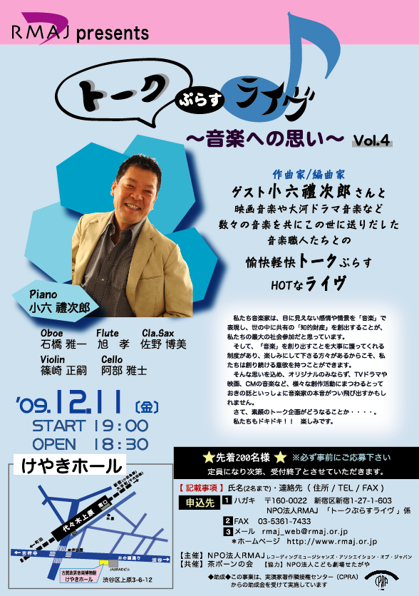 | ■ トークぷらすライヴ〜音楽への思い〜Vol.4◆’09 12/11 | | けやきホール(小田急線代々木上原駅 徒歩3分) 開場PM6:30 開演PM7:00〜