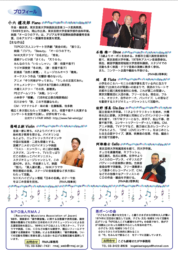 【出演】 小六禮次郎 Piano http://www.fair-wind.jp/ 石橋雅一 Oboe 旭 孝 Flute 佐野博美 Cla.Sax 篠崎正嗣 Violin 阿部雅士 Cello